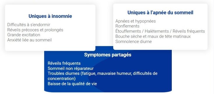 La co-existence de l’insomnie et l'apnée du sommeil est fréquente et entraîne des symptômes plus marqués que pour les patients ayant l'un ou l'autre de ces troubles du sommeil isolément4: